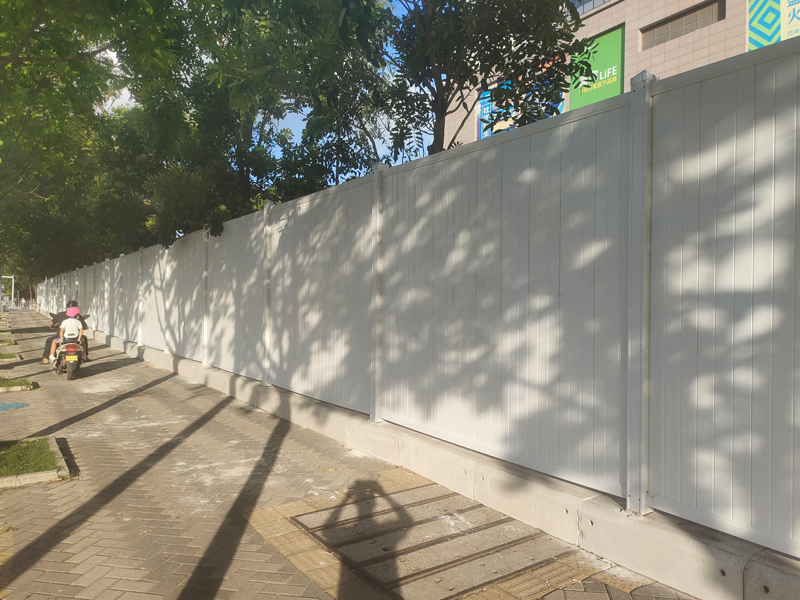 相比以前的彩鋼夾芯板圍擋更為牢固美觀,PVC圍擋的立柱、橫梁內(nèi)部都有方通鋼管內(nèi)襯以增加圍擋的強(qiáng)度,該圍擋的面板是10塊(28.5mm)內(nèi)部鏤空的純PVC